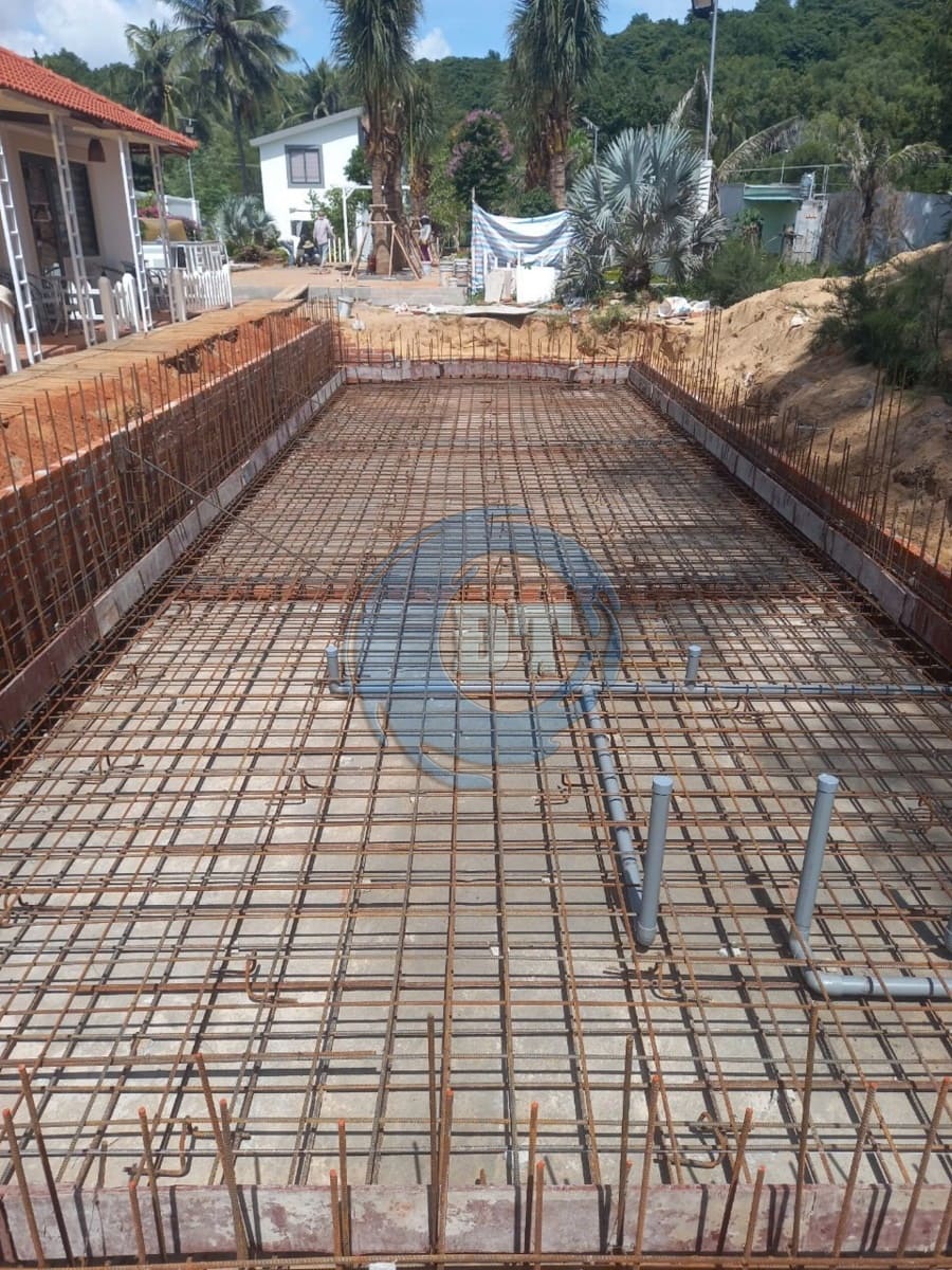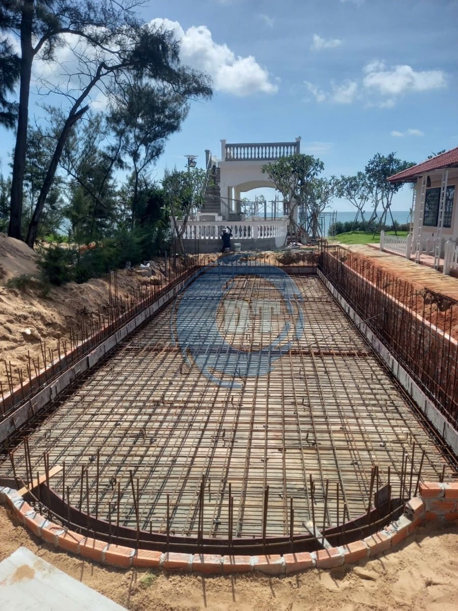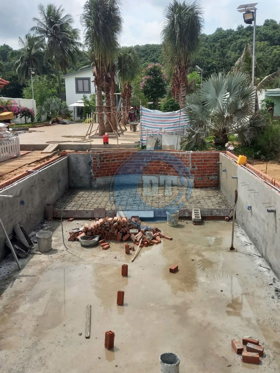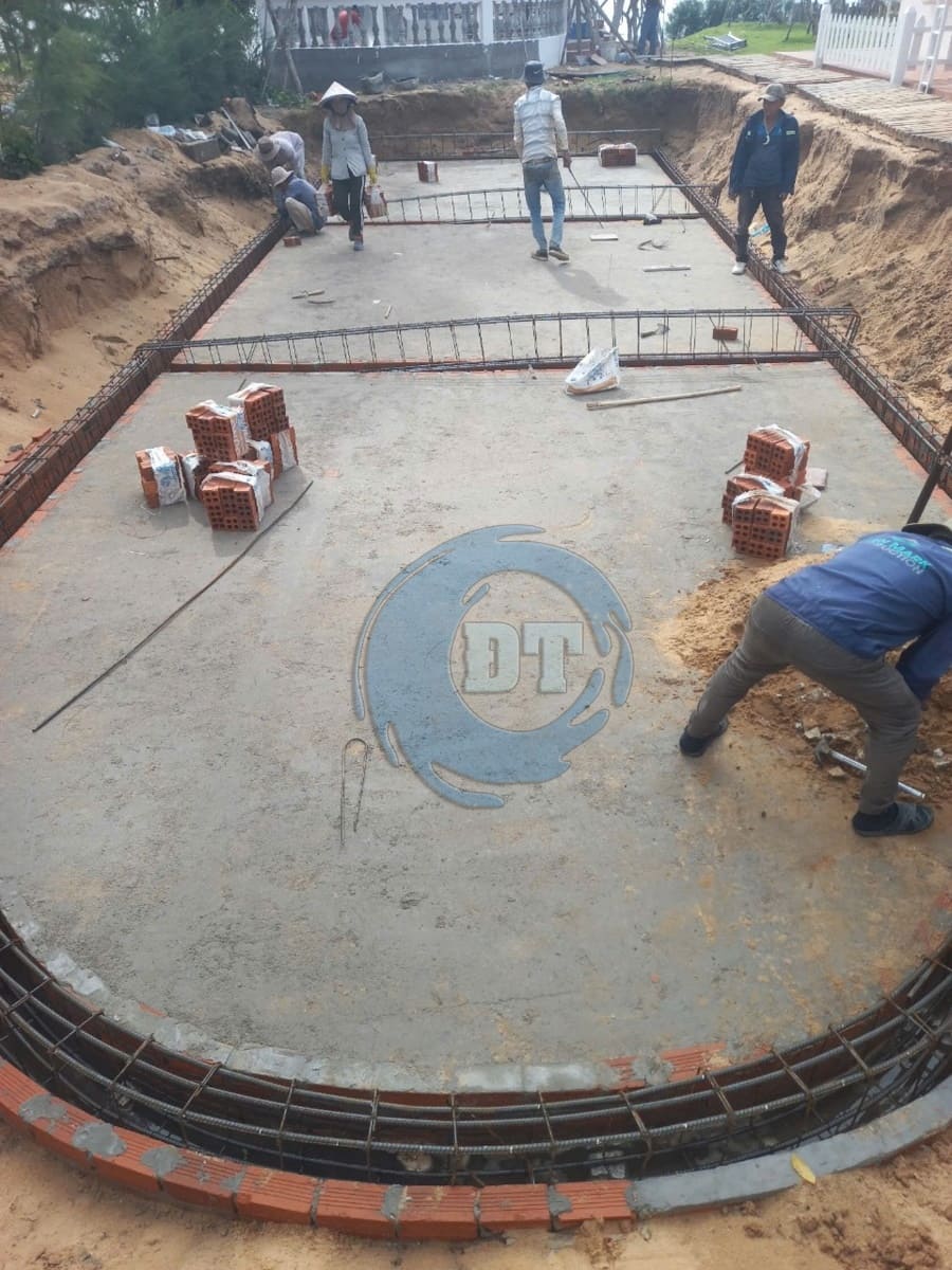 Đổ bê tông đáy hồ bơi và xây tường thành hồ