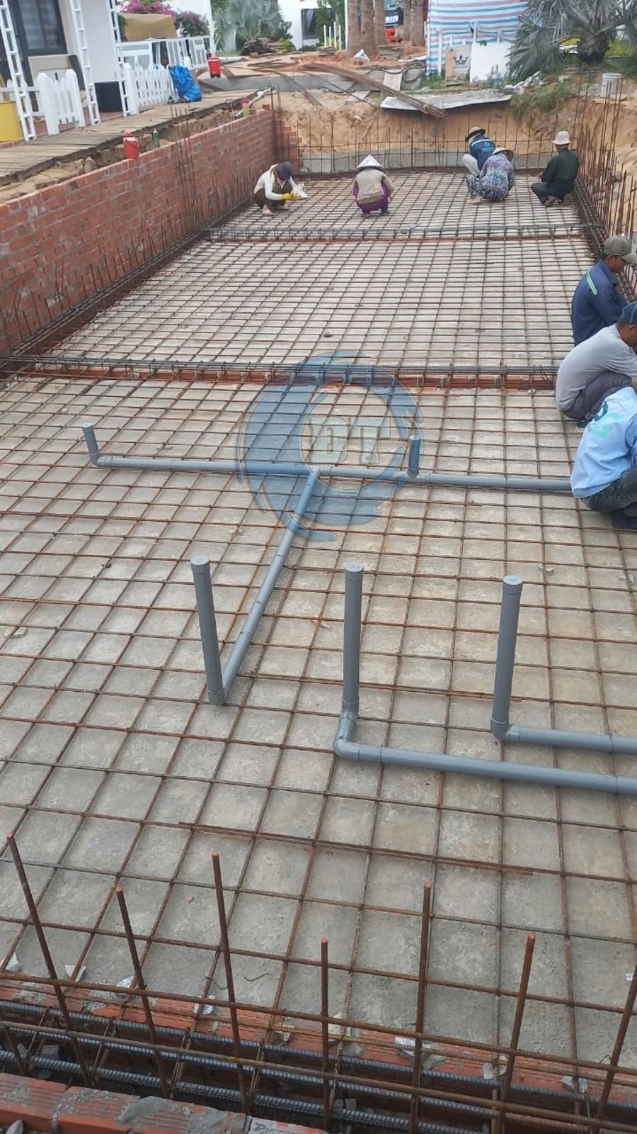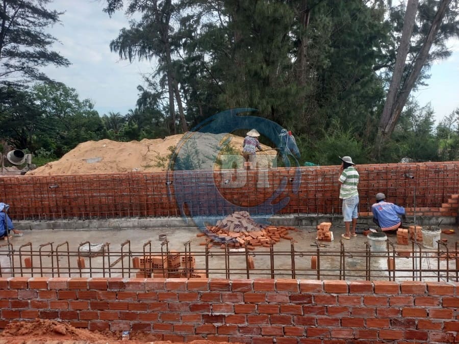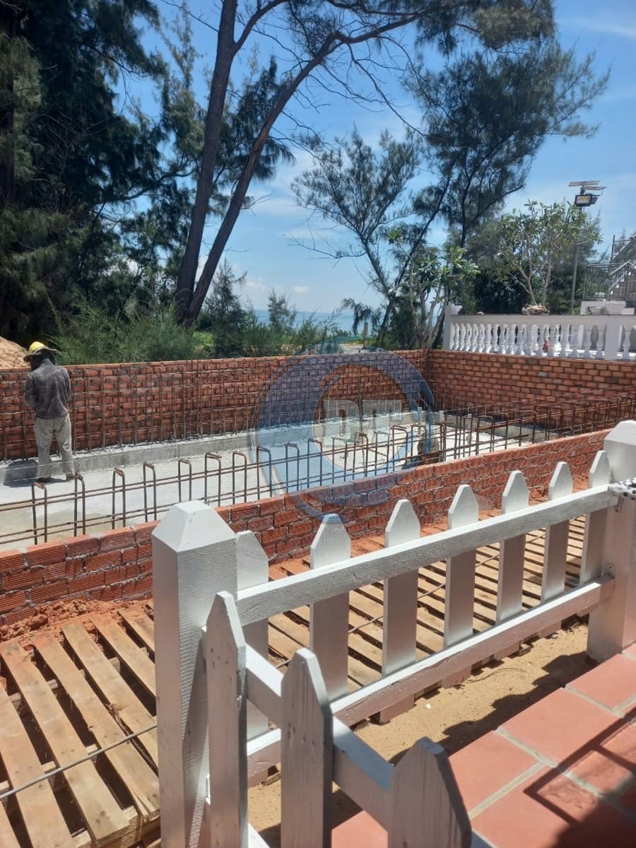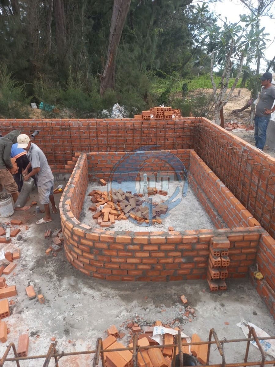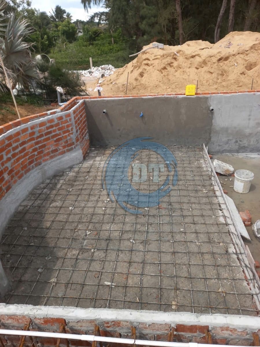 Đổ bê tông đáy hồ bơi và xây tường thành hồ